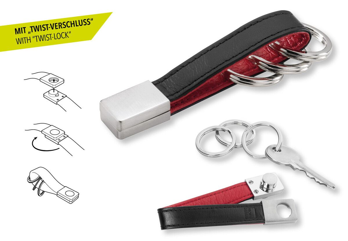 Μπρελόκ με λοξό "twist-lock", λουράκι από δέρμα, 3 κρίκους για κλειδιά, απομίμηση δέρματος / δέρμα / μέταλλο, Μαύρο