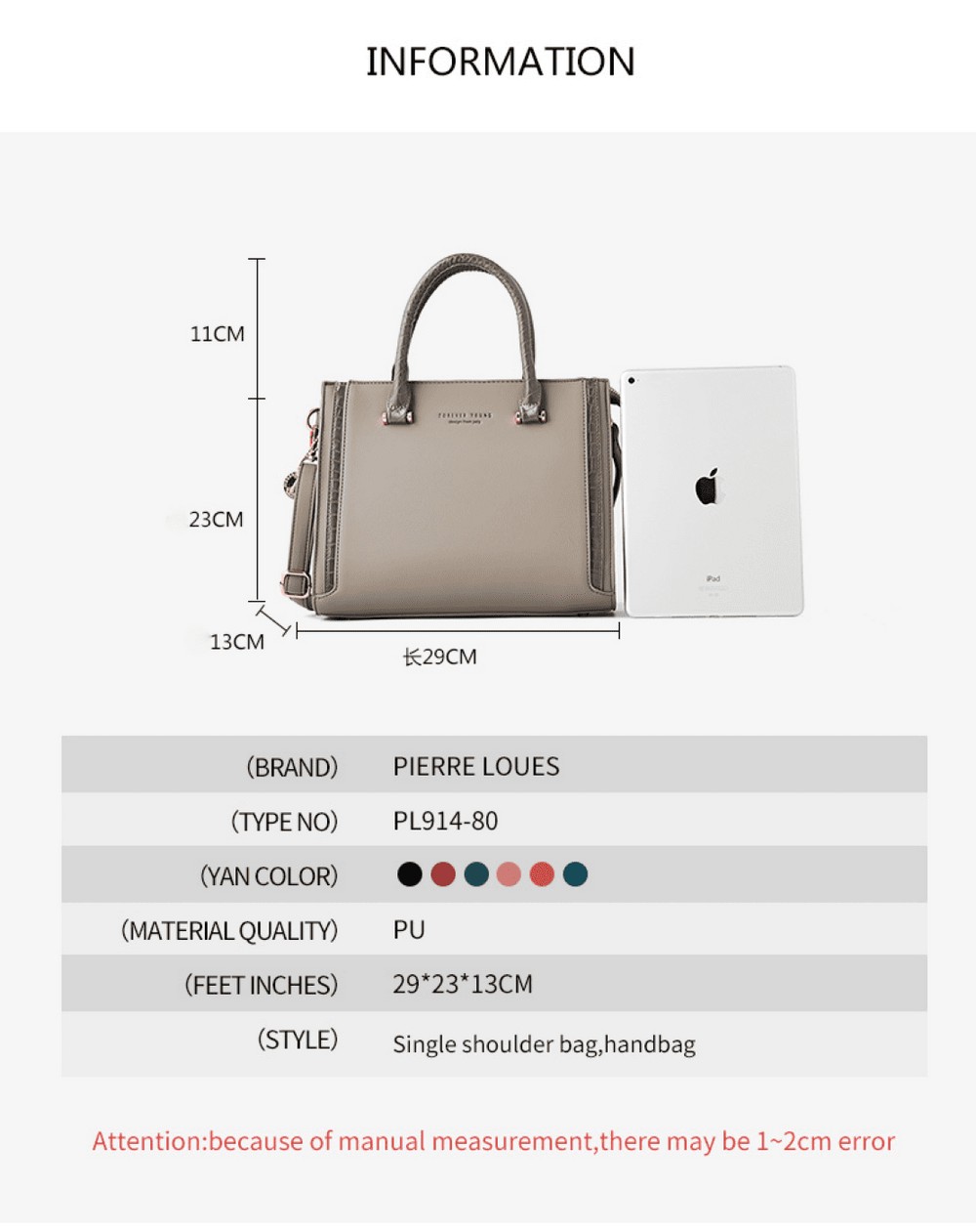 •  Χαρακτηριστικά: Μοντέρνο σχέδιο κάνουν την τσάντα κομψή και όμορφη . Χωρητικότητά για να αποθηκεύσετε τα προσωπικά σας αντικείμενα και μπορείτε εύκολα να τα οργανώσετε στο εσωτερικό.