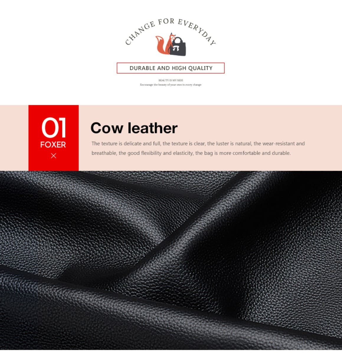- Υλικά – Η επώνυμη τσάντα χιαστί Foxer είναι κατασκευασμένη από υψηλής ποιότητας πλήρες δέρμα αγελάδας, ενισχύοντας την απαλότητα και την άνεση. Η επένδυση από πολυεστέρα είναι μεταξένια και δεν θα χαράξει τα προσωπικά σας αντικείμενα. Τα εξαρτήματα από κράμα υψηλής ποιότητας μπορούν να παραμείνουν σε καλή κατάσταση ακόμα και αν χρησιμοποιηθούν για μεγάλο χρονικό διάστημα.