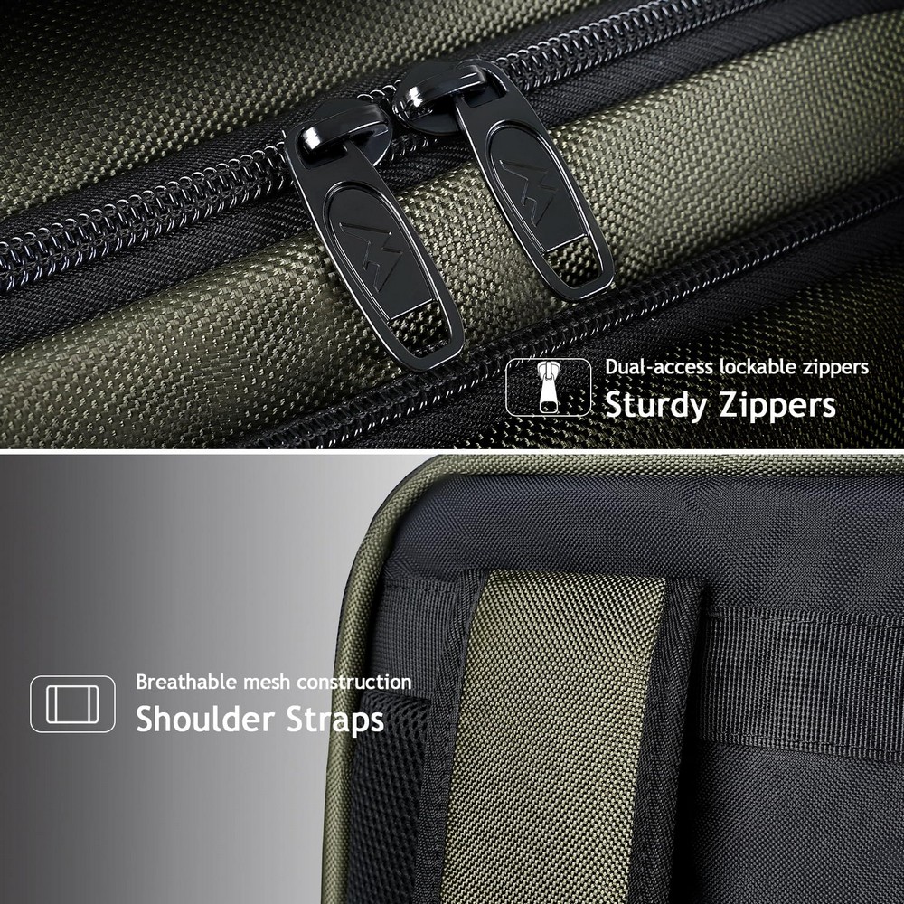 - ΑΝΘΕΚΤΙΚΟ ΥΛΙΚΟ: Το ανδρικό σακίδιο είναι καλά κατασκευασμένο από αδιάβροχο και ανθεκτικό νάιλον ύφασμα με μεταλλικά φερμουάρ. Διαθέτει μεταλλικά φερμουάρ που κλειδώνουν στην τσέπη του φορητού υπολογιστή για να προστατεύουν τον υπολογιστή σας από τους κλέφτες (πρέπει να κλειδώσετε τη θήκη του φορητού υπολογιστή με τη δική σας κλειδαριά) . Η επάνω λαβή με επένδυση από αφρό είναι άνετη στη μεταφορά για μεγάλο χρονικό διάστημα