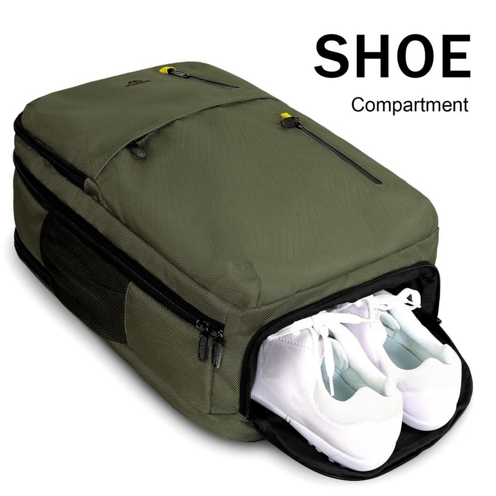 - ΘΗΚΗ ΓΙΑ ΠΑΠΟΥΤΣΙΑ: Η θήκη για τα παπούτσια είναι κατασκευασμένη στο κάτω μέρος του σακιδίου για να διατηρεί τα παπούτσια χωριστά και οτιδήποτε άλλο καθαρό. Αυτός ο χώρος αποθήκευσης παπουτσιών είναι αρκετά ευρύς ώστε να χωράει το μέγεθος 10-12 τόσο για γυναικεία όσο και για ανδρικά παπούτσια που μπορούν επίσης να χρησιμοποιηθούν ως τσάντες καλλωπισμού και για άλλες χρήσεις. Υπάρχουν δύο οπές εξαερισμού στη θήκη των παπουτσιών, που το κάνουν να αναπνέει